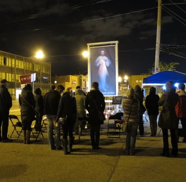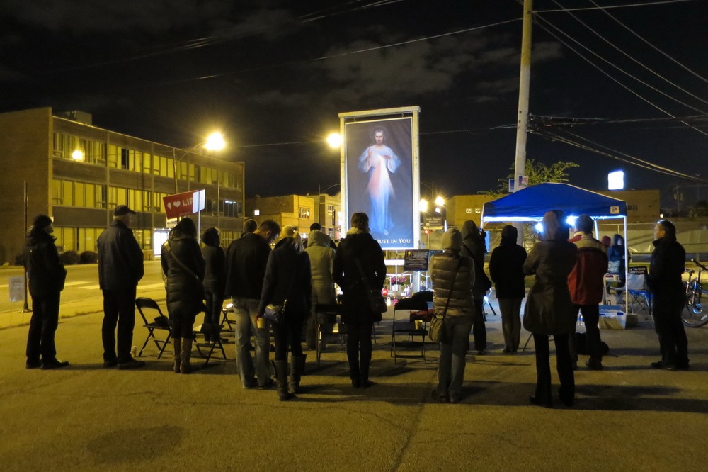 W piątek, 17 października 2015 roku, nasza wspólnota WŻCh wraz z zaproszonymi gośćmi po raz kolejny zgromadziła się na modlitwie przed kliniką aborcyjną na ulicy Elston w Chicago. Braliśmy udział w kampanii na rzecz obrony nienarodzonych w USA. W tym roku ta ogólnoświatowa już, 24 godzinna modlitwa przez okres 40 dni odbywała się w 307 miejscowościach na całym świecie. Na dzień dzisiejszy wiadomo jest, że owocem tegorocznej akcji „40 dni dla życia” jest ocalonych co najmniej 543 istnień ludzkich. Tym co dla nas było wielką radością i znakiem działania Boga to zamknięcie kliniki aborcyjnej przy 5086 N Elston, przed którą przez ostatnie kilka lat modliliśmy się. Sobota, 18 października była ostatnim dniem kiedy klinika była otwarta. Do końca czterdziestodniowej kampanii modlący się dziękowali Bogu za ten wspaniały znak i cud. Pierwszego listopada, na placu przed kliniką odbyła się uroczysta Msza św. dziękczynna, której przewodniczył biskup Alberto Rojas, a po niej procesja z Najświętszym Sakramentem dookoła nieczynnej już kliniki.