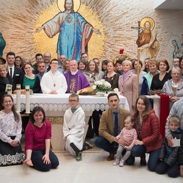 Nasze duchowo adoptowane dzieci urodzą się w cichą i świętą noc Wigilii Bożego Narodzenia (24 grudnia 2019), kiedy to Wielki i Wszechmogący Bóg uświęcił nasze ludzkie życie, stając się jednym z nas, przychodząc na świat jako małe, bezbronne niemowlę. Eucharystia o godzinie 13:00 była naszą comiesięczną Mszą św. wspólnotową (WŻCh). Piękną oprawę liturgiczną przygotowała grupa Effata. Bardzo poruszającym momentem była procesja z darami, podczas której rodzice razem z dziećmi nieśli do ołtarza kwiaty, chleb, Pismo Święte, wodę i wino. Był to obraz tego co często dzieje się w naszym życiu, kiedy tak naprawdę już nie wiadomo kto kogo prowadzi bliżej do Boga: „Duży Małego czy Mały Dużego”.