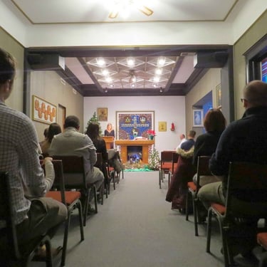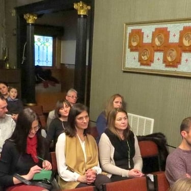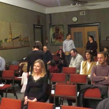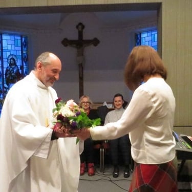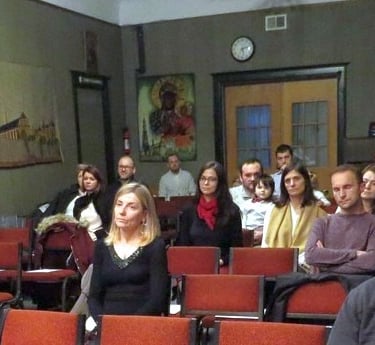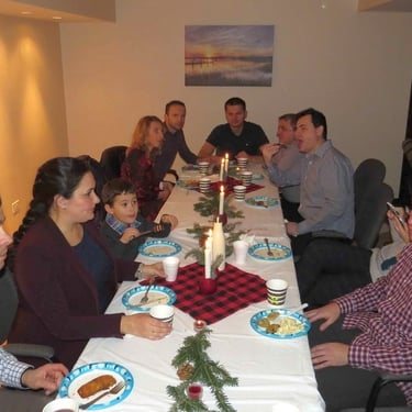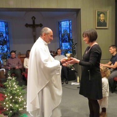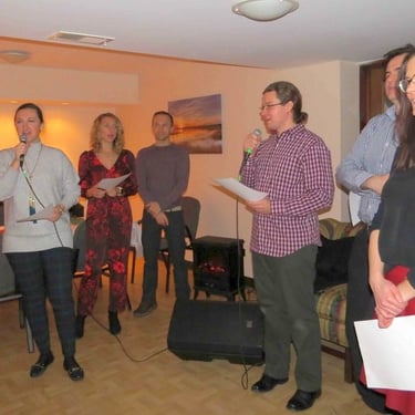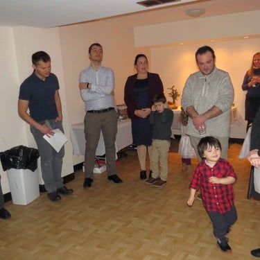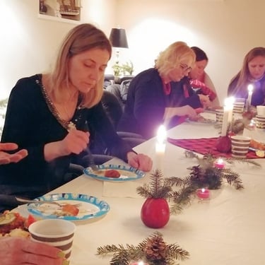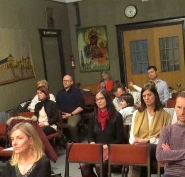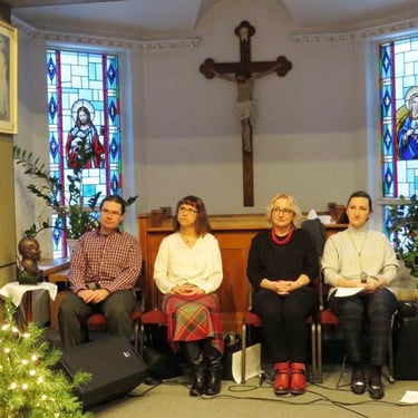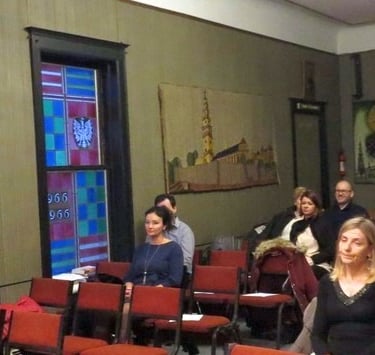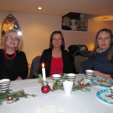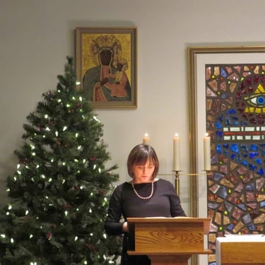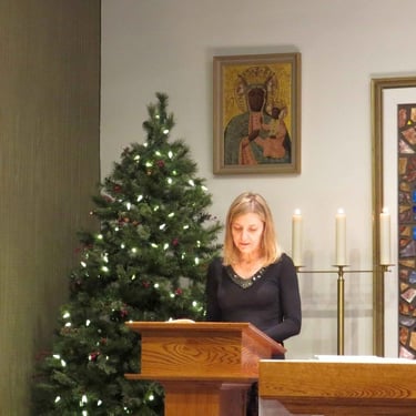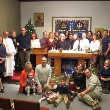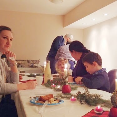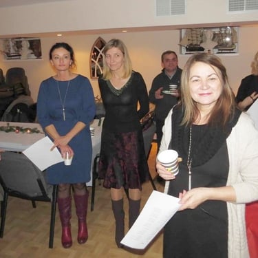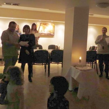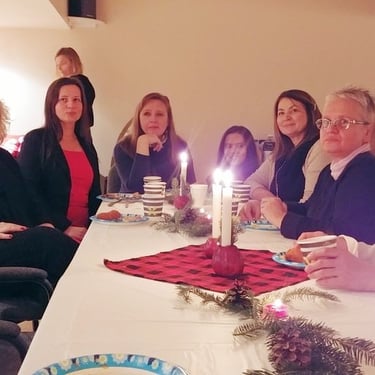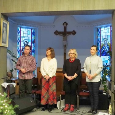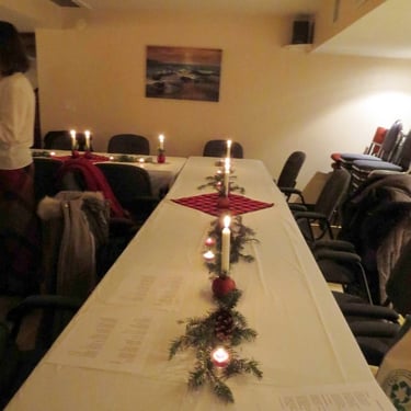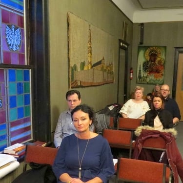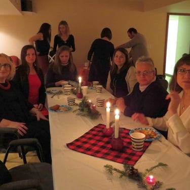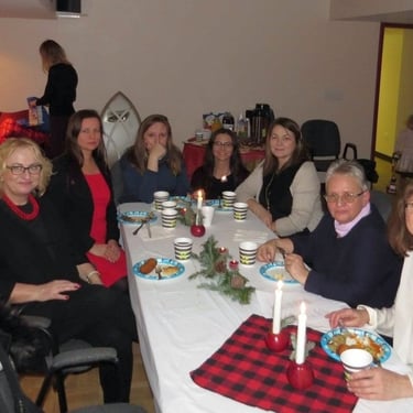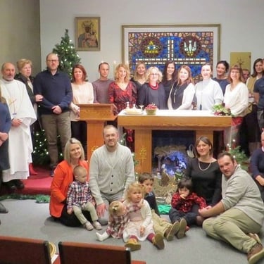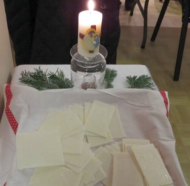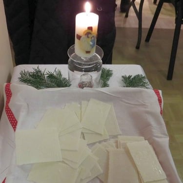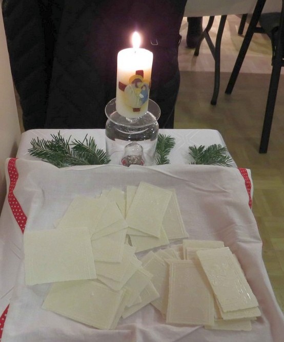 Nasze wspólnotowe spotkanie opłatkowe miało miejsce po Mszy świętej, 12 stycznia 2020 roku. Czekała na nas pięknie udekorowana sala. Białe obrusy na stołach, pachnące gałązki choinki , przygaszone światła i płonące na stołach świece stwarzały niepowtarzalny świąteczny nastrój. Do jedzenia przygotowano tradycyjne polskie przysmaki. Gorący barszczyk i krokiety znikały w błyskawicznym tempie. Po wstępnym posileniu się, spontanicznie przeszliśmy do śpiewania kolęd.