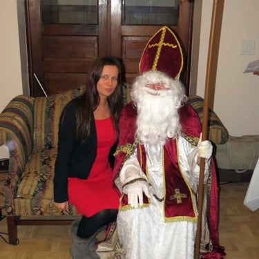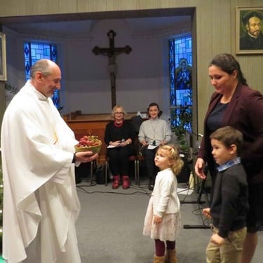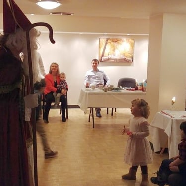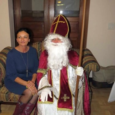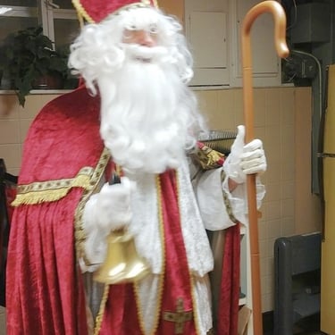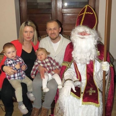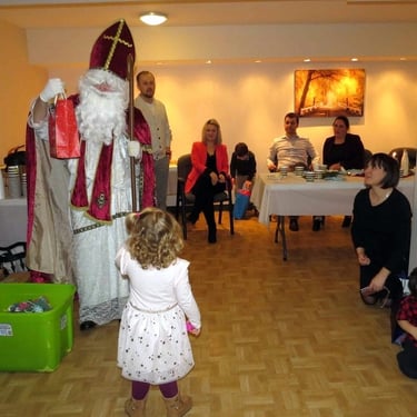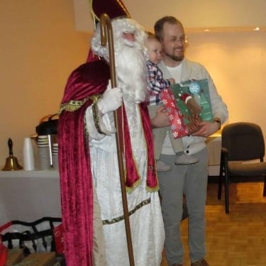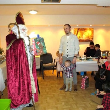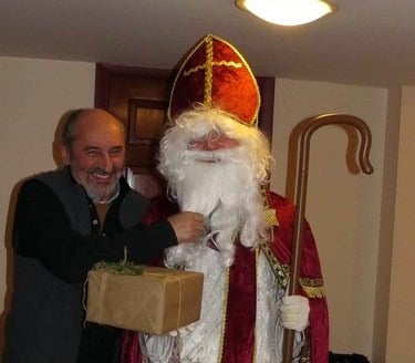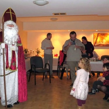 Nagle, głośne dźwięki dzwonków przerwały nasze kolędowanie. Po chwili w drzwiach ukazała się postać świętego biskupa Mikołaja. Przyszedł pogościć się z nami i rozdać przyniesione prezenty. Dzieciom udało się bez większego trudu dostać swoje podarunki. Dorosłym nie poszło już tak łatwo. Święty Mikołaj miał dla każdej z grup dużą paczkę, ale aby ją otrzymać należało wykazać się znajomością katechizmu. Strach padł na nas wszystkich, ale wspólnymi siłami zdołaliśmy pomóc przedstawicielom grup wyrecytować wyuczone w dzieciństwie prawdy wiary. W pudłach znajdowały się owoce, którymi mieliśmy się między sobą podzielić, tak jak to jest z każdym otrzymanym od Boga darem.