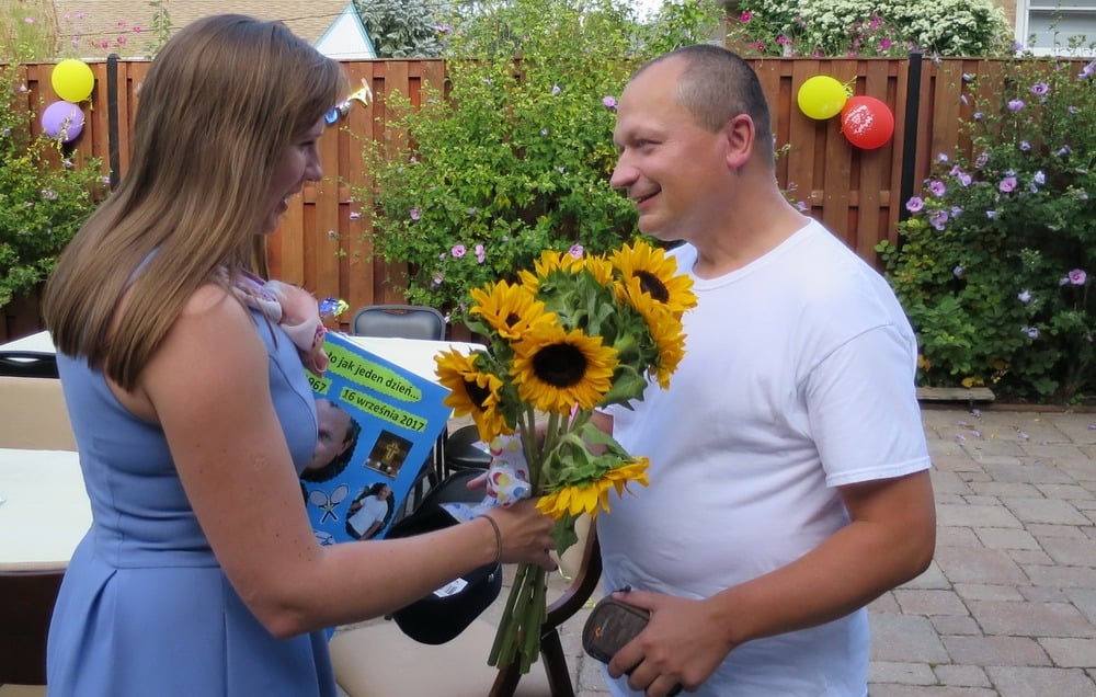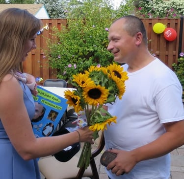 W sobotę, 16 września 2017, opiekun naszej wspólnoty WŻCh, o. Jerzy Mordarski, obchodził swoje 50 Urodziny. Z tej też okazji, przygotowaliśmy Mu niespodziankę, którą było przyjęcie urodzinowe na domowym podwórku jednej rodziny z naszej wspólnoty. Pogoda dopisała, było ciepło i słonecznie. Oprócz członków WŻCh zaproszeni też byli przyjaciele Ojca i znajomi. Goście zebrali się pół godziny przed przyjściem solenizanta, aby Go zaskoczyć. Na początek wspólnie zaśpiewaliśmy Mu „STO LAT” przy dźwiękach gitary. Nasza Koordynatorka Lokalna, Aneta, złożyła Ojcu życzenia od nas wszystkich i wręczyła Mu olbrzymią humorystyczną kartkę urodzinową wraz z bukietem słoneczników. Po czym goście złożyli Ojcu życzenia.